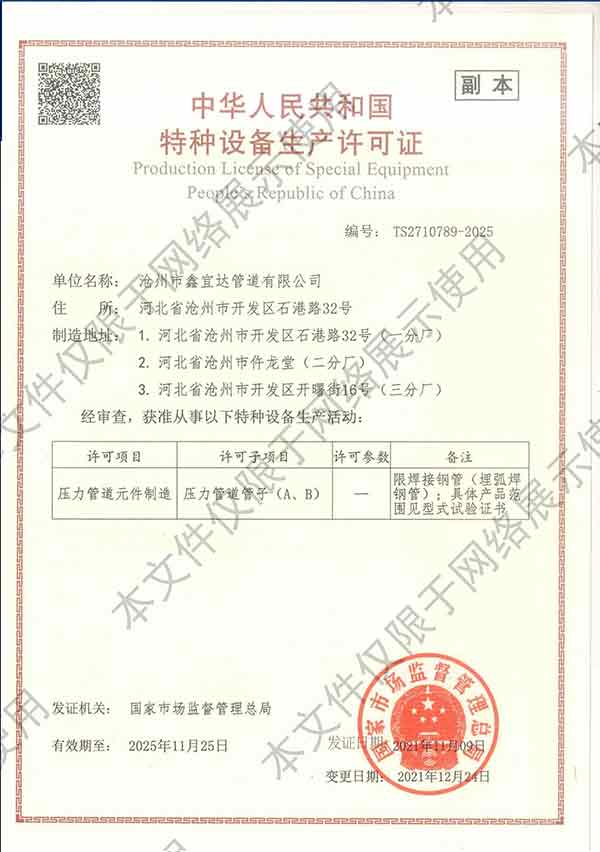 滄州市鑫宜達(dá)管道有限公司成立于2003年7月,坐落于滄州經(jīng)濟(jì)開發(fā)區(qū),占地面積40萬平方米,注冊(cè)資金1.81億元,是集螺旋鋼管生產(chǎn)、防腐加工以及無縫鋼管、卷板、帶鋼等品類鋼材經(jīng)營(yíng)銷售于一體的工貿(mào)型企業(yè)。公司現(xiàn)有員工400多人,其中,中高級(jí)技術(shù)職稱的人員達(dá)120余名。 滄州市鑫宜達(dá)管道有限公司擁有9條螺旋鋼管生產(chǎn)線和3PE防腐生產(chǎn)線,可生產(chǎn)直徑219--3640mm,壁厚5.5--28mm,最高鋼級(jí)X100的各種規(guī)格防腐螺旋鋼管...
